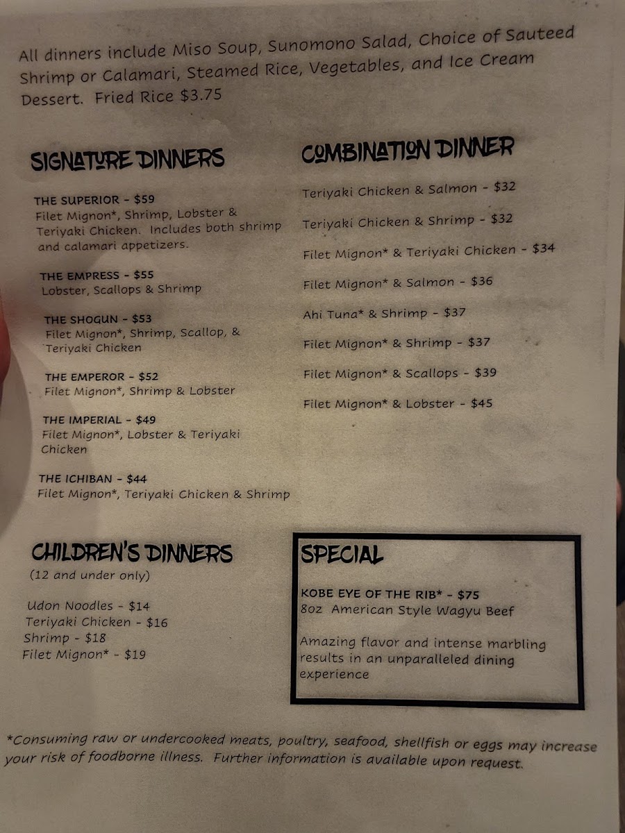 Offering a diverse menu, Ichiban really knows how to please every palate. Whether you’re drawn to the savory sweetness of Teriyaki Chicken ($22.00) or the luxurious taste of Filet Mignon ($36.00), there’s something for everyone. For seafood lovers, the Teriyaki Scallops ($36.00) and Ahi Tuna ($36.00) are simply divine, capturing the essence of Japanese flavors while showcasing the freshest ingredients. If you’re looking to make the most of your meal, the Combination Dinner selections are delightful; imagine savoring both Filet Mignon and Lobster ($45.00) in one sitting!